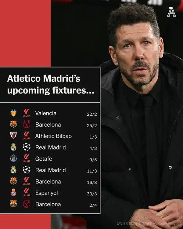 24直播网讯欧冠1/8决赛抽签结果出炉,马竞将迎战同城死敌皇马。 The Athletic报道,未来9场比赛,马竞要3次踢巴萨,2次踢皇马,赛程强度极高。 马竞未来9场赛程: 西甲vs...